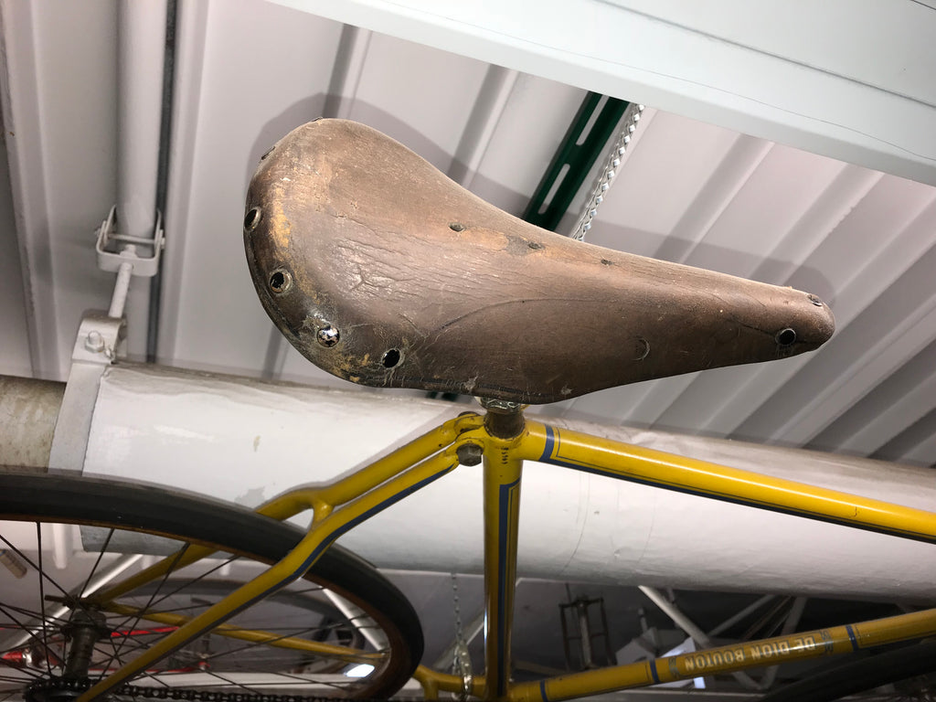 Early 1900's De Dion Bouton racing bike, fixed gear, wood rims, tubular tires, leather saddle, Primus hubs, De Dion crankset, original paint.